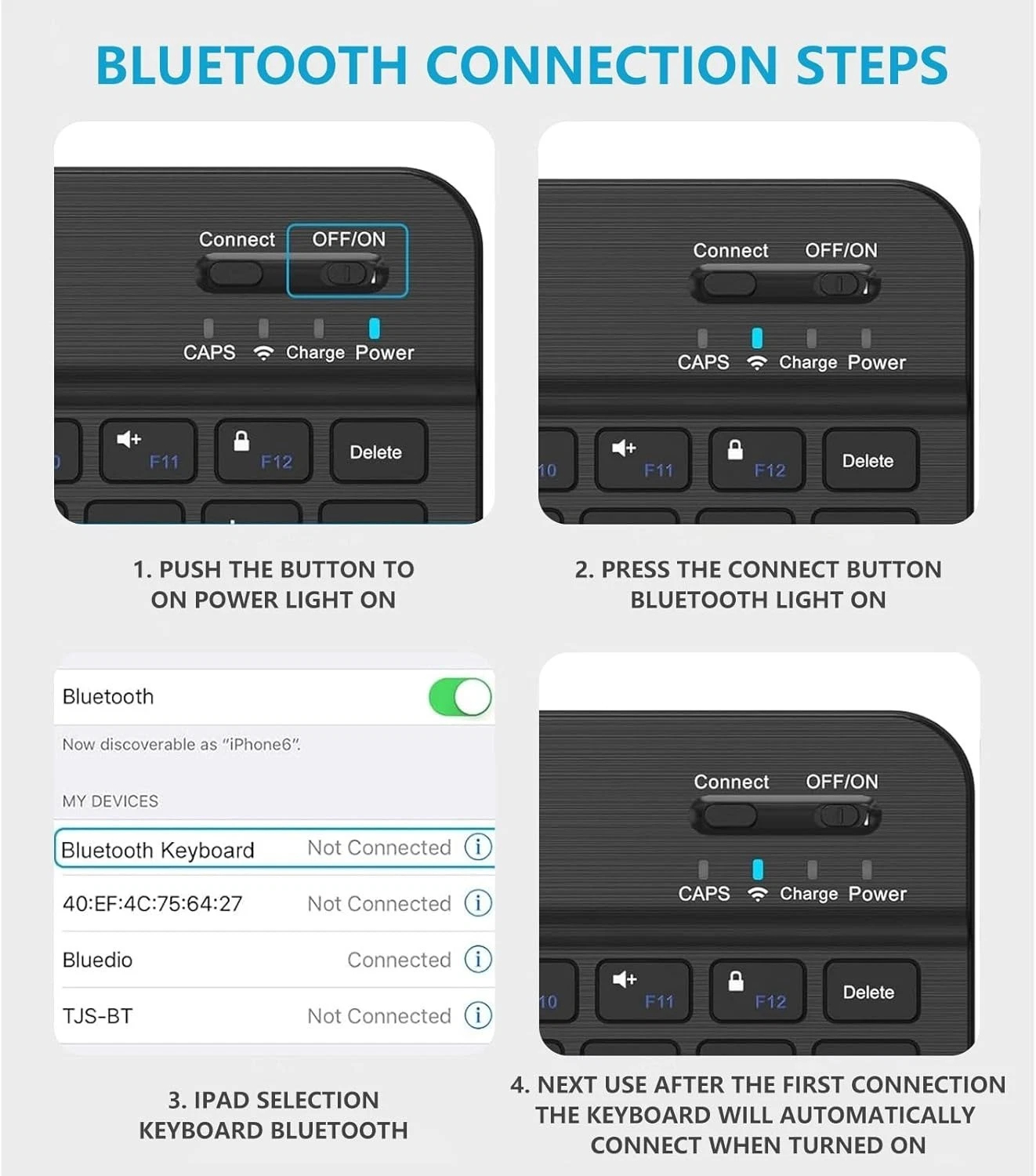 Enable Bluetooth on your device (iPad, phone, computer, etc.).